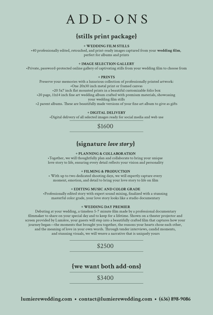Our services include breathtaking wedding highlight films, engaging social media teasers, heartfelt signature love story films, and timeless custom prints.